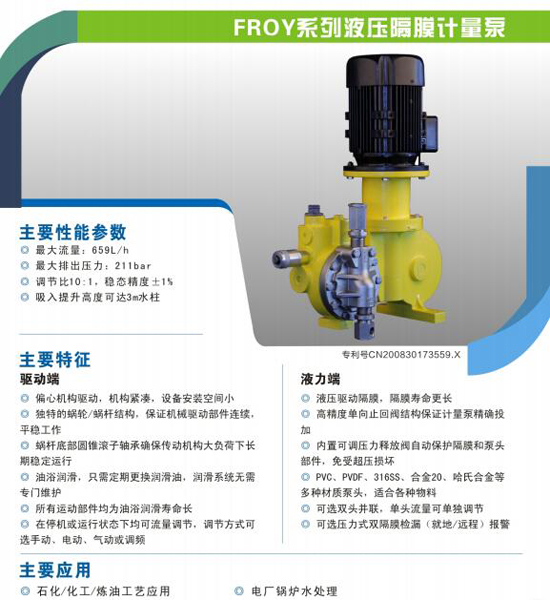 南方FROY系列液壓隔膜計量泵:偏心機構驅動,機構緊湊,設備安裝空間小。獨特的蝸輪蝸桿結構,保證機械驅動部件連續(xù)、平穩(wěn)工作。